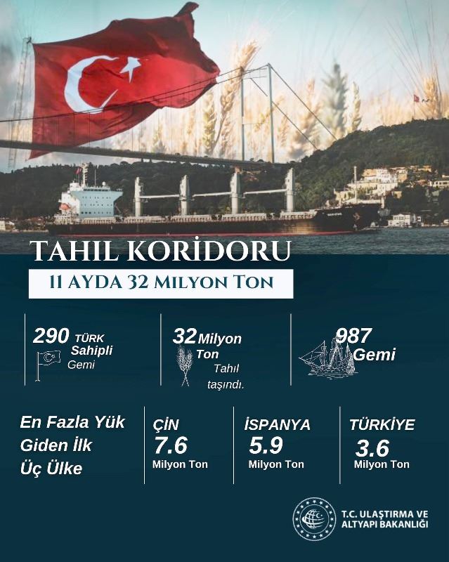 Ulaştırma Bakanı Uraloğlu koridorda taşınan tahıl hakkında bilgi vererek, “Türkiye en fazla tahılın taşındığı üçüncü ülke oldu. 44 ülkenin yer aldığı listede, 987 geminin 290’ı Türk bayraklı olup, 224 gemi ise ülkemizin farklı limanlarına geldi. Toplamda, 13 tahıl ve tahıl ürünün çeşitleri; arpa, buğday, mısır, soya, buğday kepeği, işlenmiş karışık gıda, soya fasulyesi, ayçiçeği çekirdeği, ayçiçeği küspesi, ayçiçek yağı ve bezelye bulunuyor. ‘’ dedi.