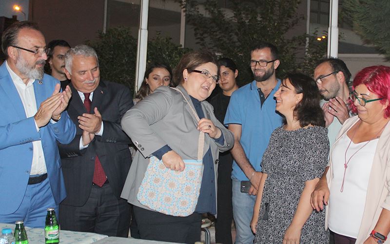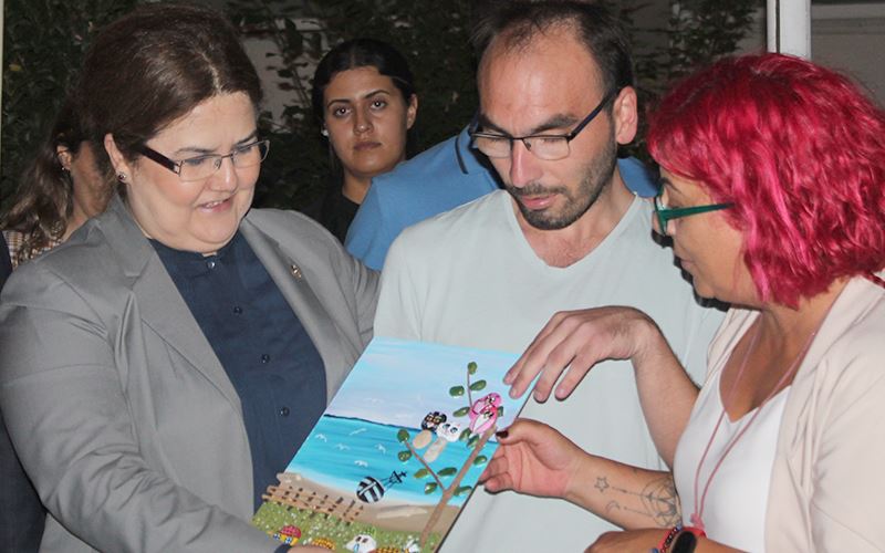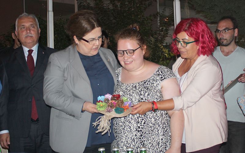 Tuğba Eskin; kozalakları boyayıp hazırladığı kapı süsünü, Mustafa Akgün; desinatör ressam Murat Akbay ile birlikte yaptığı yağlı boya tabloyu, Dernek Yönetim Kurulu Üyesi Emel Baştürk de derneğin örgü kursunda hazırladığı el emeği göz nuru çantayı Bakan Yanık’a hediye eti. Aldığı hediyelerden duyduğu memnuniyeti mimikleri ile ifade eden Bakan Yanık, çantayı omuzlarına asarak basın mensuplarına poz verdi.