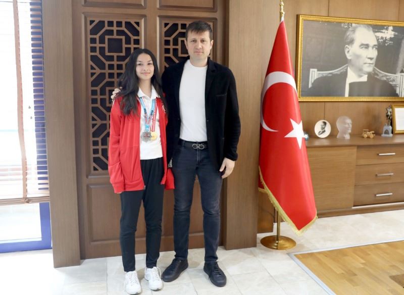 Antalya Alanya’da düzenlenen Liselerarası Gençler Türkiye Şampiyonası’nda gümüş madalya kazanan Seval Ahmet Çetin Fen Lisesi öğrencisi ve milli sporcumuz Sudenaz Kaya, Çerkezköy Belediye Başkanı Vahap Akay’a teşekkür ziyaretinde bulundu. Belediye Başkanı Vahap Akay, Milli sporcumuz Sudenaz Kaya ve babası Gökhan Kaya ile Çerkezköy Şampiyon Spor Kulübü Antrenörü Vural Ayaz, Çerkezköy Güzel Spor Kulübü Antrenörü Bilal Güzel’i makamında ağırladı.