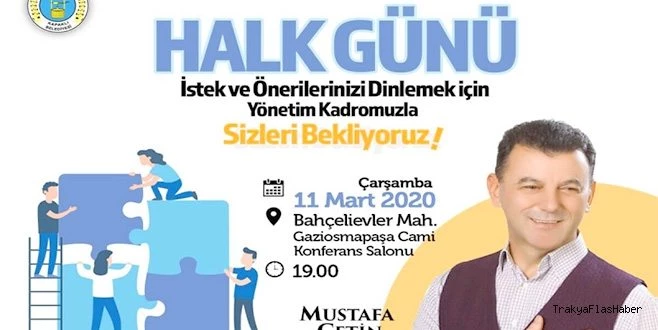Konuyla ilgili açıklama yapan Kapaklı Belediye Başkanı Mustafa Çetin;? ?Halk Günü? Buluşmalarımızın ilkini 11 Mart Çarşamba akşamı saat 19.00`da Bahçelievler Mahallemiz Gaziosmanpaşa Cami Konferans Salonu`nda gerçekleştireceğiz. Yönetim kadromuzun da hazır bulunacağı buluşmada halkımızın istek ve önerilerini yerinde dinleyip, notlarımızı alacağız. Vatandaşlarımızla bir araya gelmeye ve vatandaşlarımızla istişare etmeye büyük önem veriyoruz. Şehrimizin güzel insanlarına hizmet etmek adına ilk günkü heyecanımızla gece gündüz çalışmaya devam ediyoruz. Birlik ve beraberlik içerisinde hem kentimizin sorunlarını çözeceğiz hem de birlik ve beraberlikten doğan sinerjiyi ilçemize yayarak güzel hizmetler üreteceğiz. Bunu hep birlikte yapacağız.? dedi