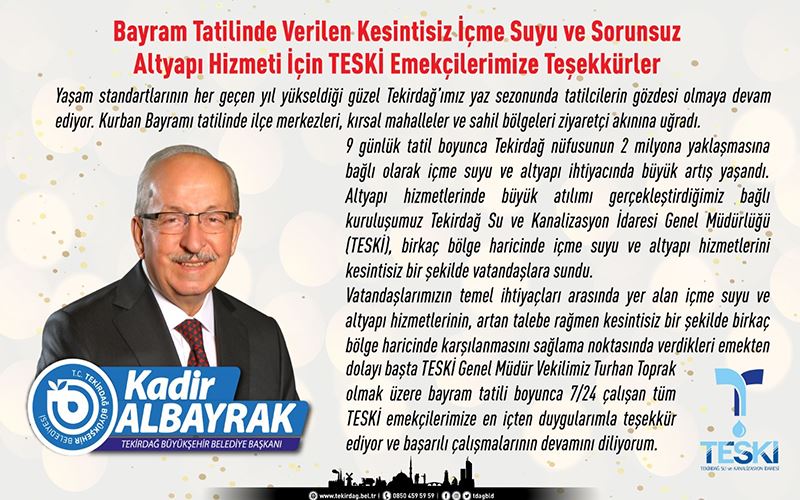 Tekirdağ Büyükşehir Belediye Başkanı Kadir Albayrak; "Kurulduğu günden bu yana sosyal belediyecilik anlayışı ile hareket eden, daha yaşanılabilir bir Tekirdağ için var gücüyle çalışan Tekirdağ Büyükşehir Belediyesi ve bağlı kuruluşu TESKİ, 9 günlük Kurban Bayramı tatili sürecinde içme suyu ve altyapı temininde başarılı bir sınav verdi." dedi.