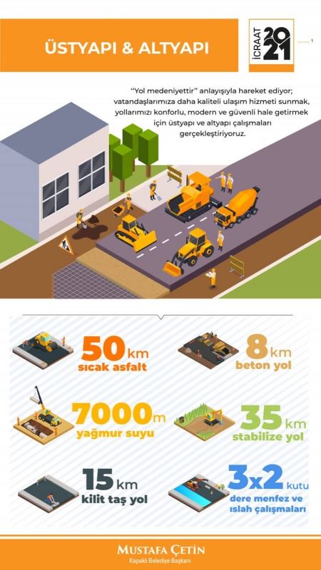 Kapaklı Belediye Başkanı Mustafa Çetin, “’Yol medeniyettir’ anlayışıyla hareket ederek; vatandaşlarımıza daha kaliteli ulaşım hizmeti sunmak, yollarımızı konforlu, modern ve güvenli hale getirmek için üstyapı ve altyapı çalışmalarımıza ağırlık verdiğimiz bir yılı geride bırakıyoruz. Tüm mahallelerimizi kapsayan programla 50 kilometre sıcak asfalt, 15 kilometre kilit taş, 8 kilometre beton, 35 kilometre stabilize yol çalışması gerçekleştirdik. Yine 7 bin metrekare yağmur suyu ve birçok deremizde kutu menfez ile ıslah çalışması yaptık.” diye konuştu.