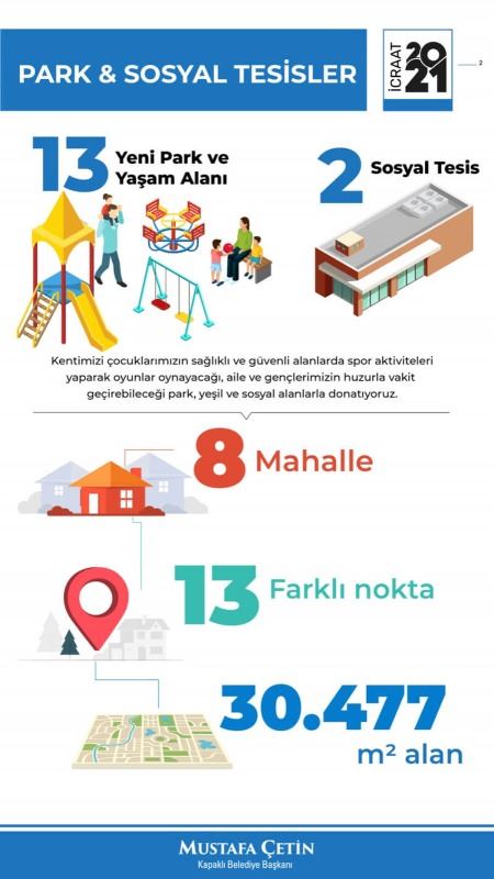 Kapaklı’yı park, yeşil ve sosyal alanlar ile donattıklarını belirten Kapaklı Belediye Başkanı Mustafa Çetin, “Kentimizi çocuklarımızın sağlıklı ve güvenli alanlarda spor aktiviteleri yaparak oyunlar oynayacağı, aile ve gençlerimizin huzurla vakit geçirebileceği park, yeşil ve sosyal alanlarla donatıyoruz. Bu kapsamda 8 mahallemizde 13 farklı noktada toplam yaklaşık 31 bin metrekare yeni park ve yaşam alanını ilçemize kazandırma çalışmalarımızı büyük oranda tamamladık. Vatandaşlarımızın aileleri ve sevdikleriyle gelerek, kaliteli hizmet alabildiği Bülent Ecevit Parkı ve Ali Baba Parkı içerisinde iki yeni sosyal tesisi hizmete sunduk. Daha yeşil, daha sosyal bir Kapaklı için çalışmalarımızı yeni yılda da sürdüreceğiz.” dedi.