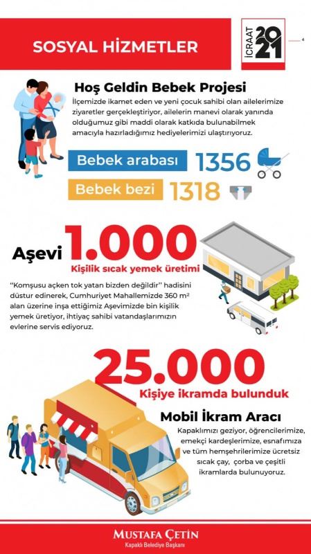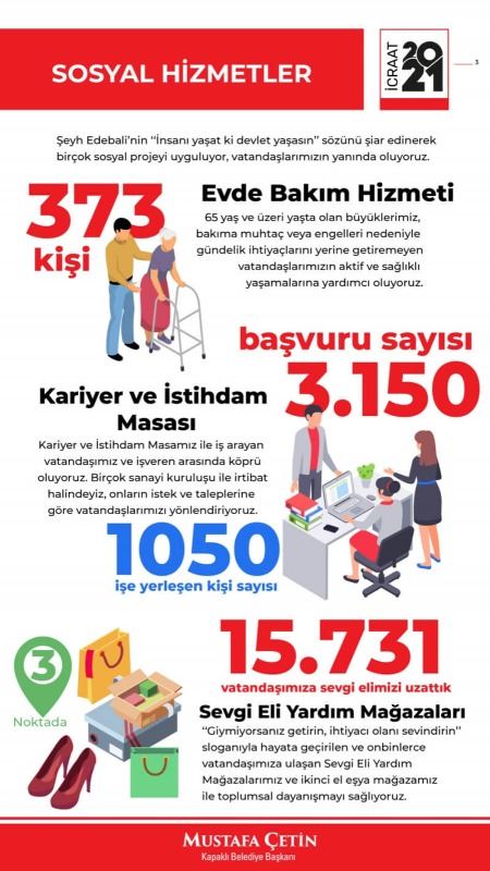 Kariyer ve İstihdam Masası aracılığıyla 1050 kişinin çeşitli iş yerleri ve kurumlarda istihdam edildiğini belirterek açıklamalarını sürdüren Başkan Çetin, “ Toplumsal dayanışmayı sağladığımız Sevgi Eli Yardım Mağazalarımız ile 15 bin 731 kişiye giysi, 58 kişiye de eşya yardımında bulunduk. Engelli ve ihtiyaç sahibi vatandaşlarımıza maddi ve gıda paketi yardımlarında bulunduk. Çölyak hastalarımıza özel gıda paketlerimizi ulaştırdık, bin 356 vatandaşımıza bebek arabası hediye ettik.” diye konuştu.