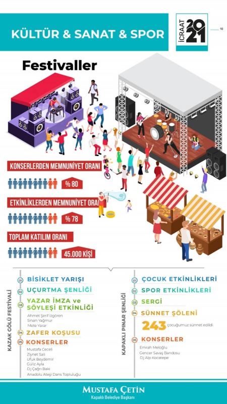Kültür, sanat ve spor etkinlikleriyle 2021 yılı değerlendirmelerine devam eden Kapaklı Belediye Başkanı Mustafa Çetin, “Kültür, sanat, spor ve mesleki onlarca kurs düzenleyerek binlerce kursiyere ulaştık. Kapaklı Sesini Arıyor adlı ödüllü Türk Halk Müziği yarışmamızı düzenledik. Bisiklet ve koşu yarışı, uçurtma şenliği, yazar söyleşileri, konserler ve çeşitli etkinliklerin yer aldığı Kazak Gölü Festivalimiz ile on binlerce kişiye ulaştık. İlkini düzenlediğimiz Pınar Bulvarı Şenliğimiz ile prestij caddemiz Pınar Bulvarı’nda birbirinden farklı etkinlikler düzenledik, sünnet şölenimiz ile yavrularımızın mutluluklarına ortak olduk.” dedi.