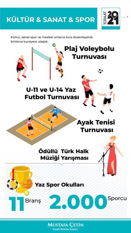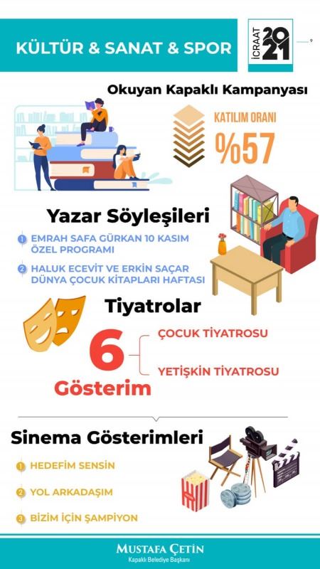 Başkan Çetin, “Halkımızın kültür ve sanat hayatını zenginleştiren etkinlikler kapsamında yetişkin ve çocuk tiyatroları ile sinema gösterimlerini, yazarları vatandaşlarımızla buluşturduk. 8 ressamın yüze yakın eserinin beğeniye sunulduğu Kent Ressamları Sergisini açtık. Okuyan Kapaklı kampanyamızı düzenledik. Çeşitli spor turnuvaları düzenledik ve 11 branşta düzenlediğimiz Yaz Spor Okullarımız ile binlerce öğrencimize ulaştık.” dedi.