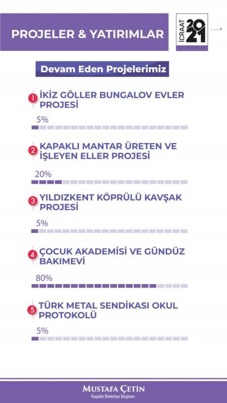 Üstyapı ve altyapı, park ve sosyal tesisler, çevre ve sıfır atık sosyal hizmetler, kültür, sanat ve spor etkinlikleri olmak üzere 5 konu başlığında değerlendirmede bulunan Kapaklı Belediye Başkanı Mustafa Çetin, 2021 yılında hayata geçirilen proje ve yatırımlar ile ilgili olarak ise şunları söyledi: