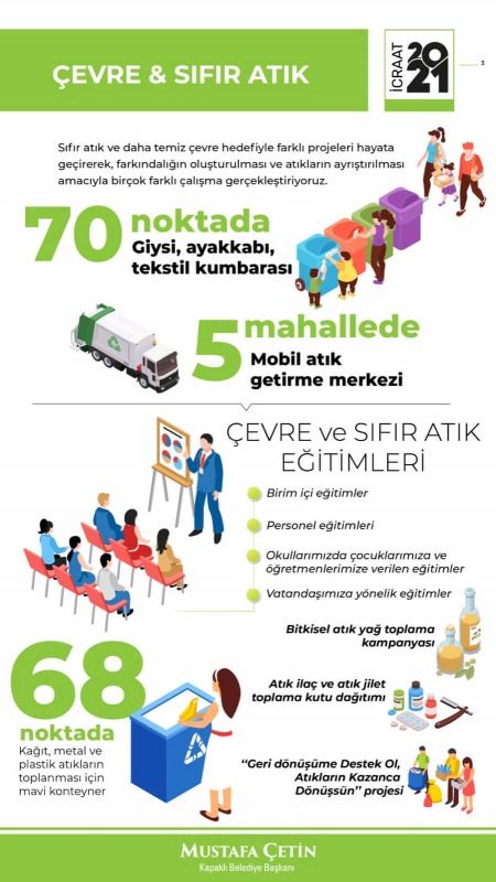 Çevre ve sıfır atık konusunda okullar başta olmak üzere bilgilendirici eğitim faaliyetlerinin de gerçekleştirildiği belirten Kapaklı Belediye Başkanı Mustafa Çetin, “Belediye bünyemize kazandırdığımız kompost makinemiz ile topladığımız organik atıkları ayrıştırıp doğal gübre haline getiriyor, Park ve Bahçeler Müdürlüğümüz bünyesinde kullanıyoruz. Ayrıca talep eden vatandaşlarımıza da ücretsiz olarak veriyoruz. Atık ilaç ve atık jilet toplama kutularımızı esnafımıza dağıttık. Bitkisel atık yağ toplama kampanyamız ile de suyumuzu koruyor, vatandaşlarımıza 5 litre atık yağ karşılığında hediye veriyoruz.” dedi.