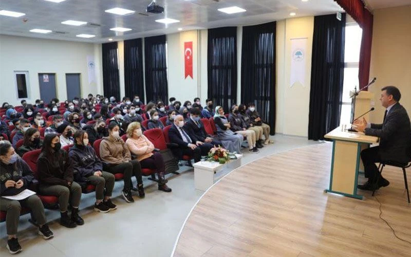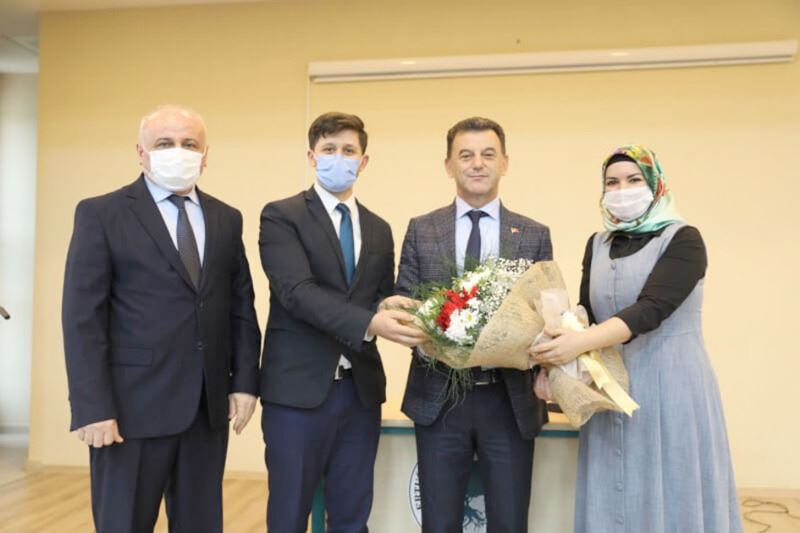 Gençlerin ve öğretmenlerin sorularını da yanıtlayan Başkan Çetin’e program sonunda İlçe Milli Eğitim Müdürü İrfan Danışmaz ve Okul Müdürü Aykut Bakar tarafından çiçek takdim edildi.
