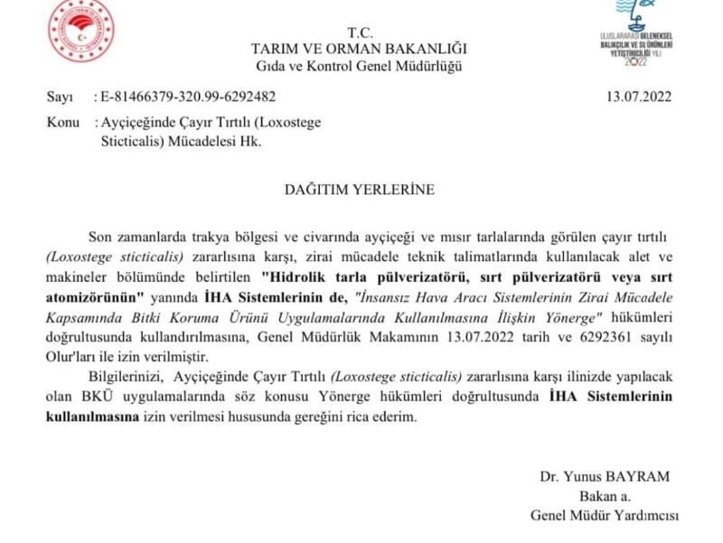 Özcan açıklamasında şunları kaydetti: "Tekirdağ'ımızın bazı bölgelerinde, özellikle ayçiçeklerde görülen çayır tırtılı zararlısı çiftçilerimizi mağdur ediyordu. Bizler de hemen bir çalışma başlatarak İHA ile ilaçlama izinlerinin alınması için Tarım İl Müdürlüğümüzle ve Bakanlığımızla görüşmeler yaptık. Hamdolsun girişimlerimiz neticesinde gerekli izinler Tarım ve Orman Bakanlığımız tarafından yayınlandı. Planlamalar yapıldı ve ilaçlama en hızlı şekilde başlayacak.