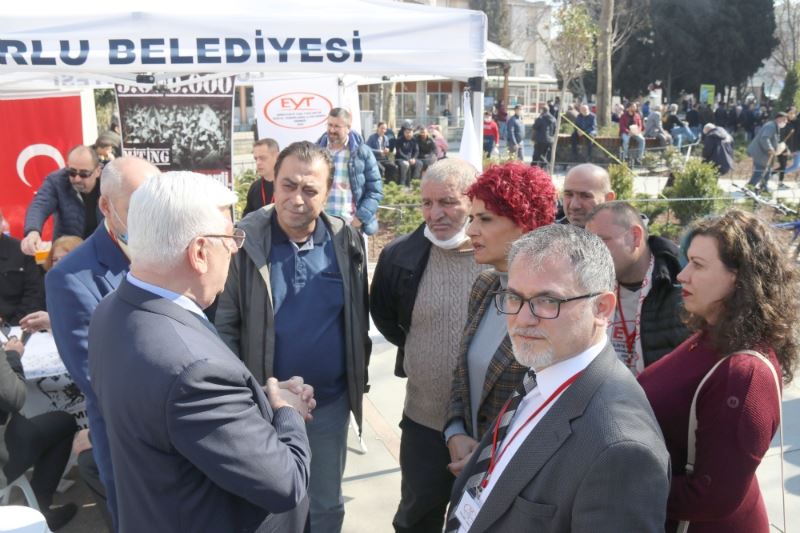Ergene Belediye Başkanı Rasim Yüksel, “Bugün komşu ilçemiz Çorlu’da Emeklilikte Yaşa Takılanlar Çorlu Sosyal Yardımlaşma ve Dayanışma Derneğinin bilgilendirme standına EYT’li emekçilerimize destek vermek için geldim. Uzun zamandan beri konuşulan bu konu netlik kazanmadı. Emekçi kardeşlerimiz sonuna kadar haklıdır. Haklarını isteyen tüm emekçi kardeşlerimin sonuna kadar destekçisi olacağım. Emek en yüce değerdir, emeklerinin karşılığını almak için mücadelelerine devam eden EYT’lilerin en kısa sürede haklarına kavuşmalarını temenni ediyorum” dedi.