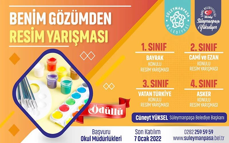 Süleymanpaşa Belediyesi Gençlik ve Spor Hizmetleri Müdürlüğü tarafından düzenlenen ve Süleymanpaşa İlçe Milli Eğitim Müdürlüğünün katkılarıyla gerçekleştirilecek olan yarışmalarda her sınıf için ayrı kategoriler belirlendi. Buna göre, ilkokul birinci sınıf öğrencileri ‘Benim Gözümden Bayrak’, ikinci sınıflar ‘Benim Gözümden Cami ve Ezan’, üçüncü sınıflar ‘Benim Gözümden Vatan Türkiye’ ve dördüncü sınıflar da ‘Benim Gözümden Asker’ temalı resimleri ile yarışmaya katılabilecekler.