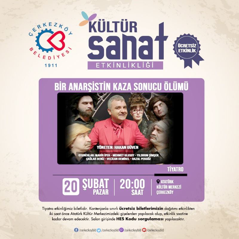 Çerkezköy Belediyesi Kültür ve Sosyal İşler Müdürlüğü, birbirinden güzel kültür-sanat etkinliklerini Çerkezköylülerle buluşturmaya devam ediyor. Etkinlikler kapsamında ‘Bir Anarşistin Kaza Sonucu Ölümü’ adlı tiyatro oyunu Çerkezköylüler için sahnelenecek.