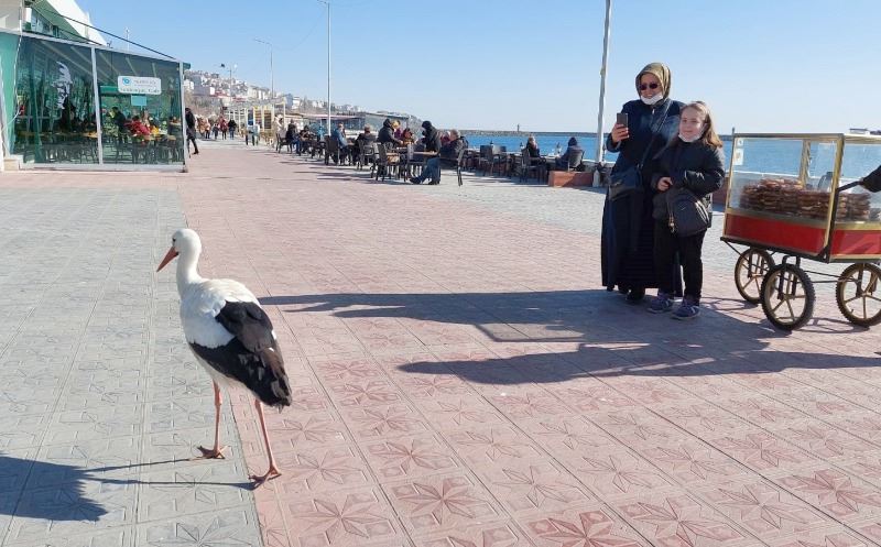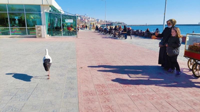 Zaman zaman sahil gezintisine çıkan leylek, vatandaşlarında yoğun ilgisiyle karşılaşıyor. Artık her yere yürüyerek giden ve şehrin maskotu haline gelen leylek, vatandaşlarla fotoğraf çekiliyor ve rahat rahat insanların ellerinden yem yiyebiliyor. Kentte insanların yakın ilgi ve alakasından dolayı leyleğin uçup başka bir yere gitmeye niyeti yok.