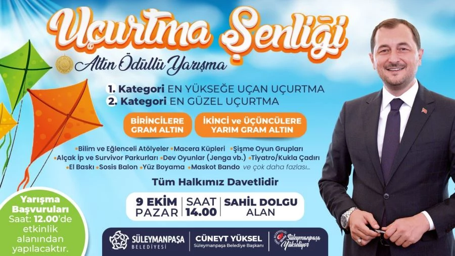 Süleymanpaşa’da yaşayan tüm çocukları ve kendini genç hissedenleri Uçurtma Şenliğine davet eden Süleymanpaşa Belediye Başkanı Cüneyt Yüksel, “Yaz mevsiminin sona ermesi ile birlikte havalar giderek soğumaya başlasa da yazdan kalma son hafta sonunu en iyi şekilde değerlendirmek ve çocuklarımıza, gençlerimize bir anlamda yaza veda etkinliği tadında son bir organizasyon hediye etmek istedik. Bu amaçla düzenlediğimiz Uçurtma Şenliğimize tüm çocuklarımızı, gençlerimizi ve kendini genç hisseden büyüklerimizi davet ediyoruz,” açıklamasında bulundu.