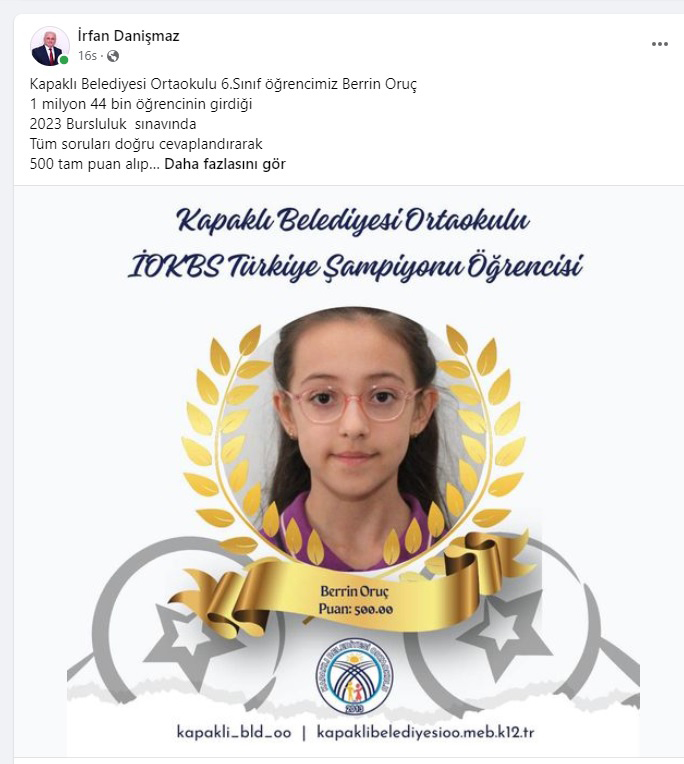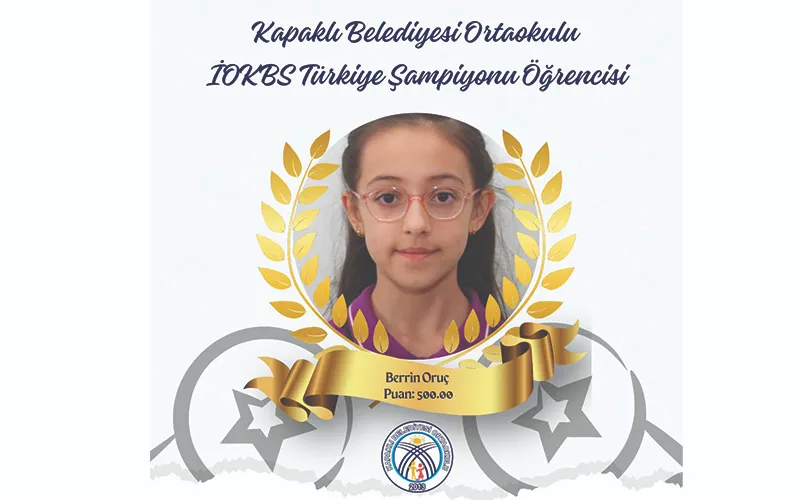 2023 Bursluluk Sınavı’nda Kapaklı Belediyesi Ortaokulu 6. Sınıf öğrencisi Berrin Oruç, 1 milyon 44 bin öğrencinin girdiği sınavda tüm soruları doğru cevaplandırdı. 500 tam puan alarak Türkiye 1’incisi olan Berrin Oruç’un bu başarısını sosyal medya hesabından duyuran Kapaklı İlçe Milli Eğitim Müdürü İrfan Danışmaz, “Emek veren öğretmenlerimizi ve öğrencimizi kutluyorum.”dedi.