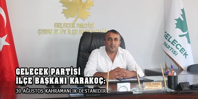 Gelecek Partisi Çerkezköy İlçe Başkanı Veysel Karakoç; ?30 Ağustos 1922?de kazanılan büyük zafer, şanlı milletimizin eşsiz destanlarından biri olarak tarihe geçmiştir.? dedi.