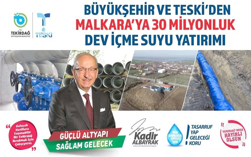 Tekirdağ Büyükşehir Belediyesi, insan odaklı ve çevreye duyarlı hizmetlerine hız kesmeden devam ediyor. Bu kapsamda Büyükşehir Belediyesinin bağlı kuruluşu Tekirdağ Su ve Kanalizasyon İdaresi Genel Müdürlüğü (TESKİ) bünyesinde Malkara ilçesi Yörgüç Mahallesinden başlayarak Çavuşköy - OSB su deposunda son bulan 30 Milyon TL değerindeki yeni bir isale hattı inşaatı tamamlandı. İçme Suyu İsale Hattı 14 Ocak’ta gerçekleşecek açılış töreni ile hizmete sunulacak.