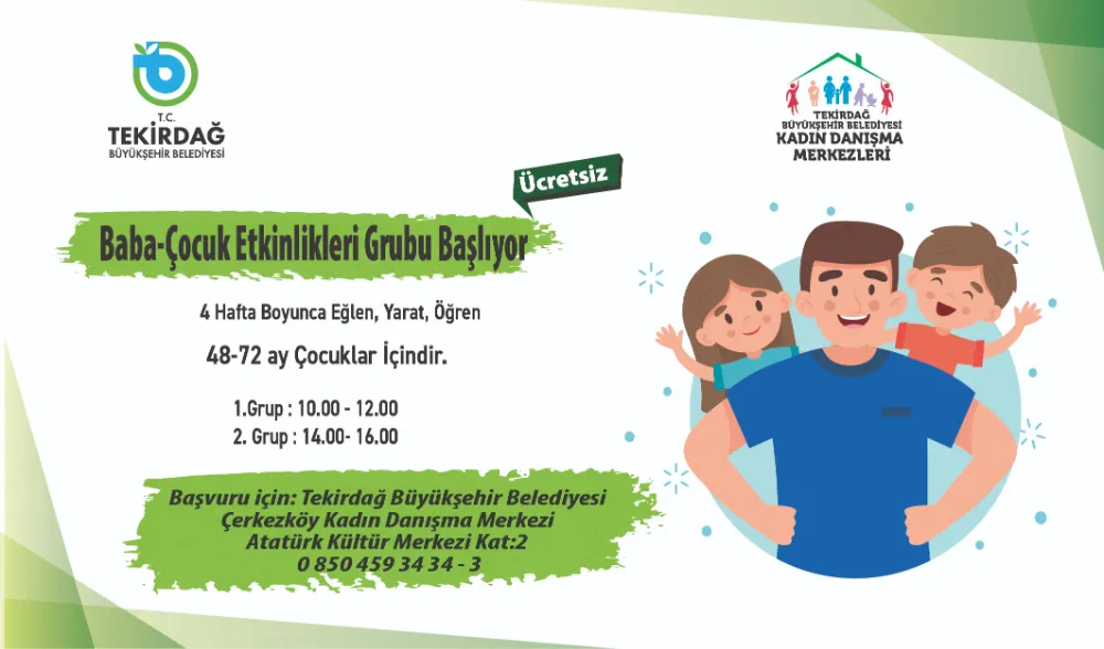 Sosyal belediyecilik anlamında kurulduğu ilk günden bugüne altyapıdan üstyapıya, kültür sanattan spora kadar birçok alanda hayata geçirdiği projelerle örnek olan Tekirdağ Büyükşehir Belediyesi tarafından "Baba Çocuk Etkinlik Grubu” başlatıldı. Çerkezköy Kadın Danışma Merkezi’nde başlatılan Baba Çocuk Etkinlik Grubu programı ile babaya çocuğuyla vakit geçirmesi konusunda nasıl uyumlu olacağını yaşatarak öğretilmesi ve bu kapsamda çocukların bilişsel, sosyal-duygusal, fiziksel ve dil gelişim alanlarının her birine uygun etkinlikler düzenlenmesi amaçlanıyor. Çerkezköy Kadın Danışma Merkezi tarafından başlatılacak olan program, haftada bir gün olmak üzere 4 hafta sürecek ve ücretsiz olarak hizmet verecek. "Baba Çocuk Etkinlik Grubu” programı kayıt almaya devam ediyor.