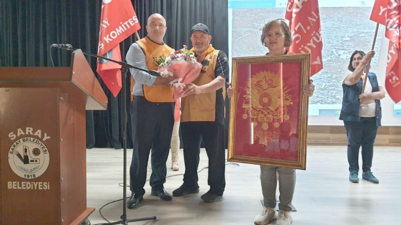 57. Alay Yürüyüş Komitesi Başkanı Hikmet Selim Yılmaz, Saray Belediye Başkanı Özgen Erkiş’e 57. Alay rozeti taktı. Başkan Erkiş de 57. Alay Yürüyüş Komitesi Başkanı Hikmet Selim Yılmaz’a teşekkür ederek çiçek takdim etti.