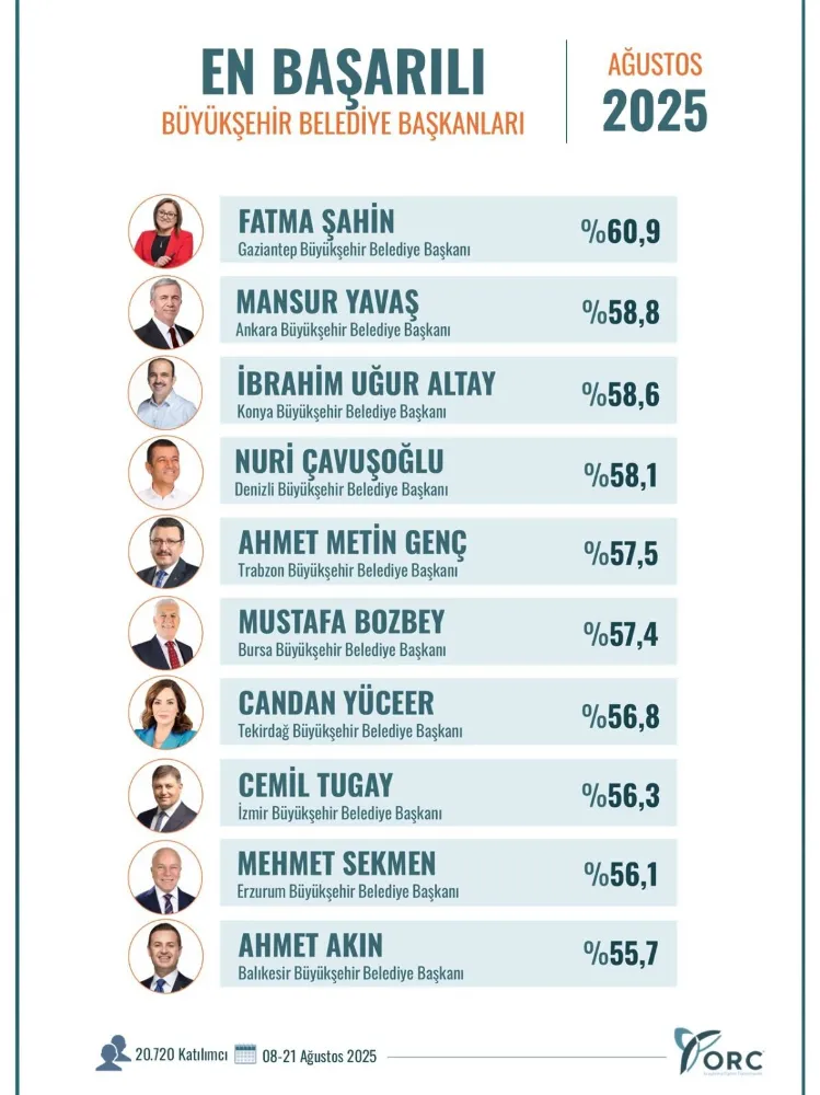 Araştırmada, Gaziantep Büyükşehir Belediye Başkanı Fatma Şahin yüzde 60,9 ile birinci, Ankara Büyükşehir Belediye Başkanı Mansur Yavaş yüzde 58,8 ile ikinci, Konya Büyükşehir Belediye Başkanı İbrahim Uğur Altay yüzde 58,6 ile üçüncü sırada yer aldı. Tekirdağ Büyükşehir Belediye Başkanı Dr. Candan Yüceer ise yüzde 56,8 oranla Türkiye genelinde yedinci sırada yer aldı.