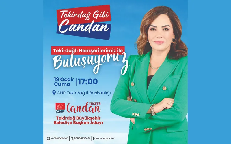 CHP’nin Tekirdağ Büyükşehir Belediye Başkan Adayı Candan Yüceer, yarın seçmenle ilk buluşmasını gerçekleştirecek. Yüceer 19 Ocak Cuma günü 17.00’da Tekirdağ İl Başkanlığı önünde vatandaşlarla buluşacak ve seçim startını verecek.