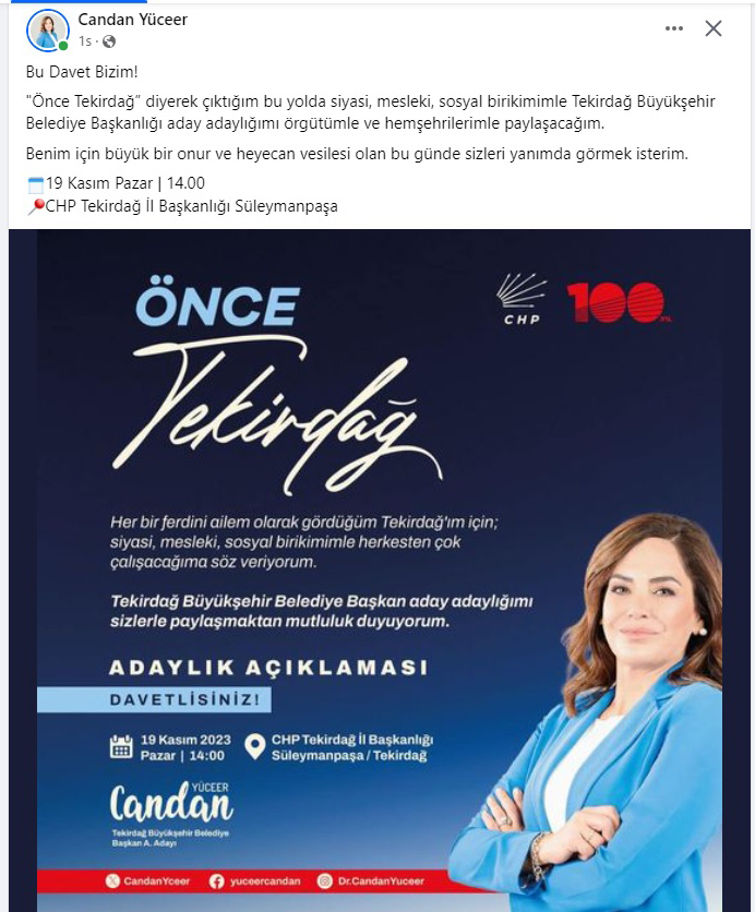 Sosyal medya hesabından bir duyuruda bulunan Candan Yüceer, CHP Tekirdağ İl Başkanlığı’nda Pazar günü yapacağı Büyükşehir Belediyesi aday adaylığı açıklaması için tüm Tekirdağlılara davette bulundu.