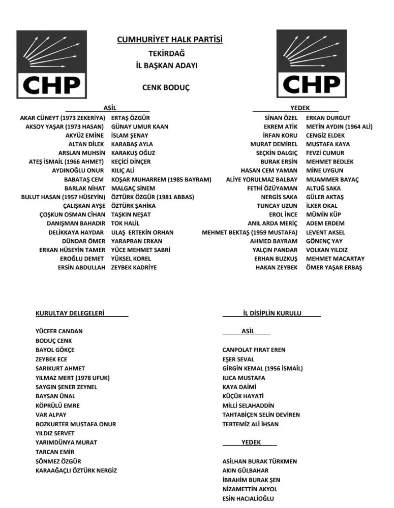 CHP 39. Tekirdağ İl Kongresi’nde il yönetimiyle birlikte kurultay delegeleri listesi de kesinleşti. CHP Çerkezköy İlçe Başkan Adayı olan Özgür Sönmez de yer aldı.