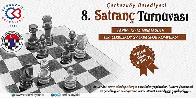 Tekirdağ Büyükşehir Belediyesi 29 Ekim Spor Kompleksi?nde 13-14 Nisan tarihlerinde düzenlenecek Çerkezköy Belediyesi 8. Geleneksel Satranç Turnuvası?na TSF lisansına sahip 2018-2019 yılı vizesi yapılmış, 2012 ve öncesinde doğan, 2199 ve altında ELO puanına sahip sporcular katılabilirler.
