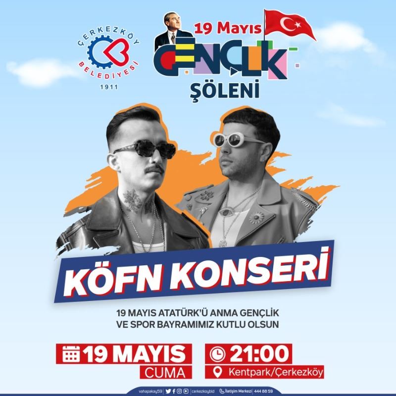 Çerkezköy Belediyesi tarafından 19 Mayıs Atatürk’ü Anma Gençlik ve Spor Bayramı dolayısıyla gerçekleştirilecek Gençlik Festivali etkinlikleri kapsamında ünlü müzik grubu KÖFN 19 Mayıs Cuma günü saat 21.00’de Kent Park’ta sahne alacak.