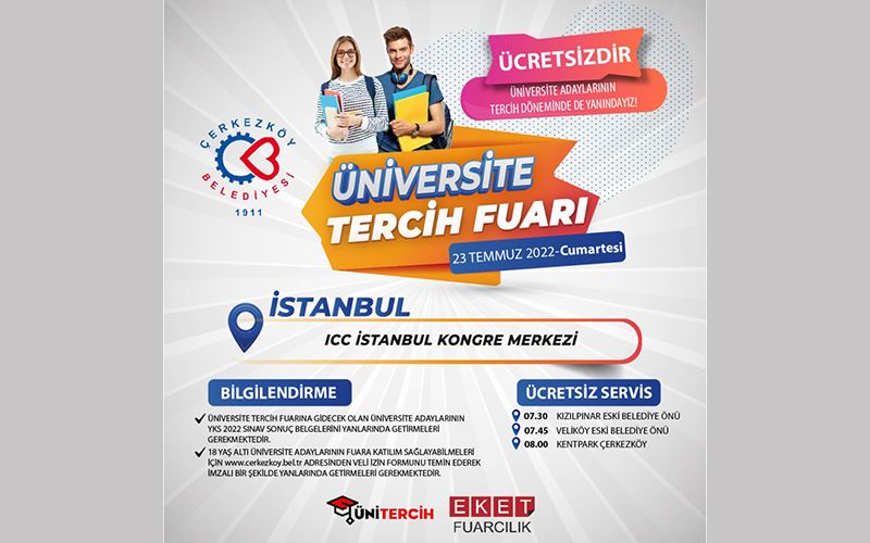 Çerkezköy Belediyesi, üniversite adaylarını ücretsiz olarak, İstanbul’da gerçekleştirilecek olan Üniversite Tercih Fuarı’na götürüyor.