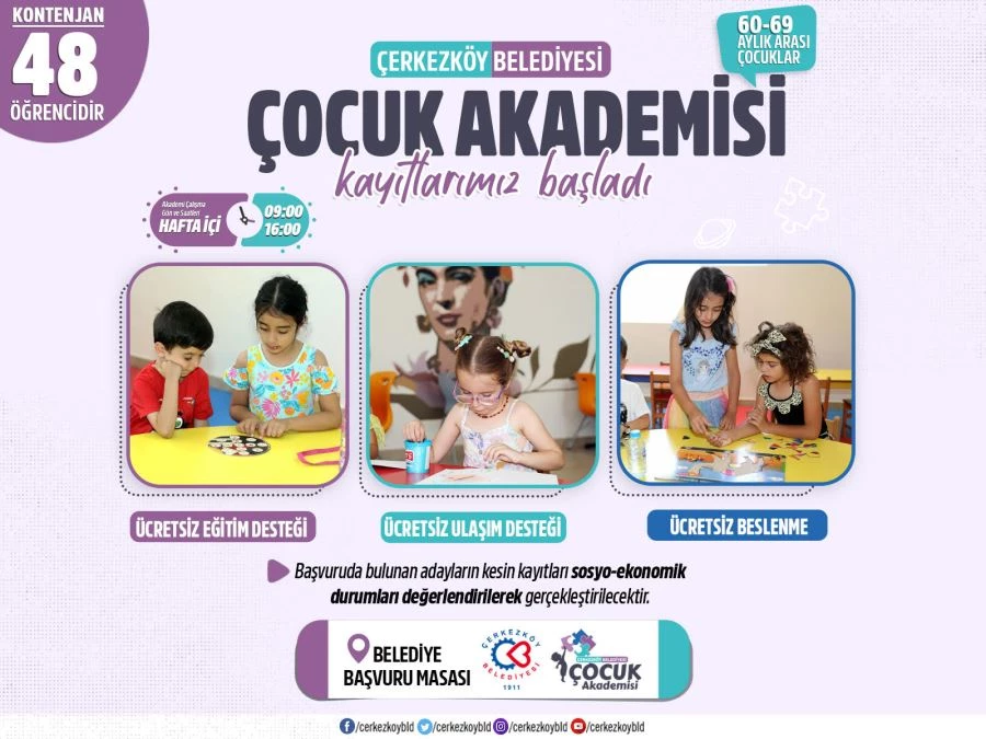 Çerkezköy Belediyesi tarafından açılacak olan ve 60-69 aylık arası çocuklara hizmet verecek olan Çocuk Akademisi başvuruları Çerkezköy Belediyesi İletişim Merkezi’ne yapılmaya başlandı.