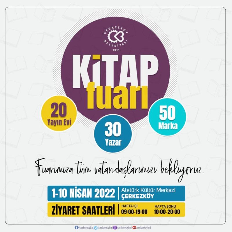 Çerkezköy Belediyesi tarafından 1-10 Nisan tarihleri arasında Çerkezköy Belediyesi Atatürk Kültür Merkezi’nde Kitap Fuarı düzenlenecek.