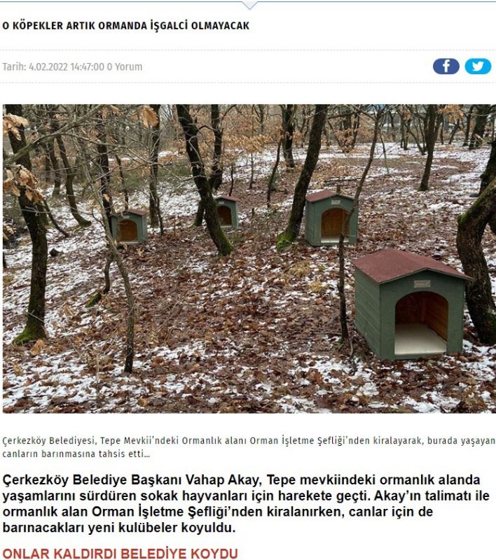 Tepe mevkiindeki ormanlık alanda yaşamlarını sürdüren sokak hayvanları için geçtiğimiz şubat ayında 7 adet köpek kulübesi koyan Çerkezköy Belediyesi, önceki gün bu kulübeleri kaldırdı. Belediyenin kulübeleri kaldırması üzerine hayvan severlerden çok sayıda tepki geldi. Belediyenin sokaktaki canların barınması için koyduğu kulübeler için iki ay önce teşekkür eden hayvan severler, bu kez teşekkürlerini geri aldıklarını sosyal medya hesaplarından paylaştı. Onlarca hayvan sever, kulübelerin kaldırılmasına bir mana veremediğini paylaştı.