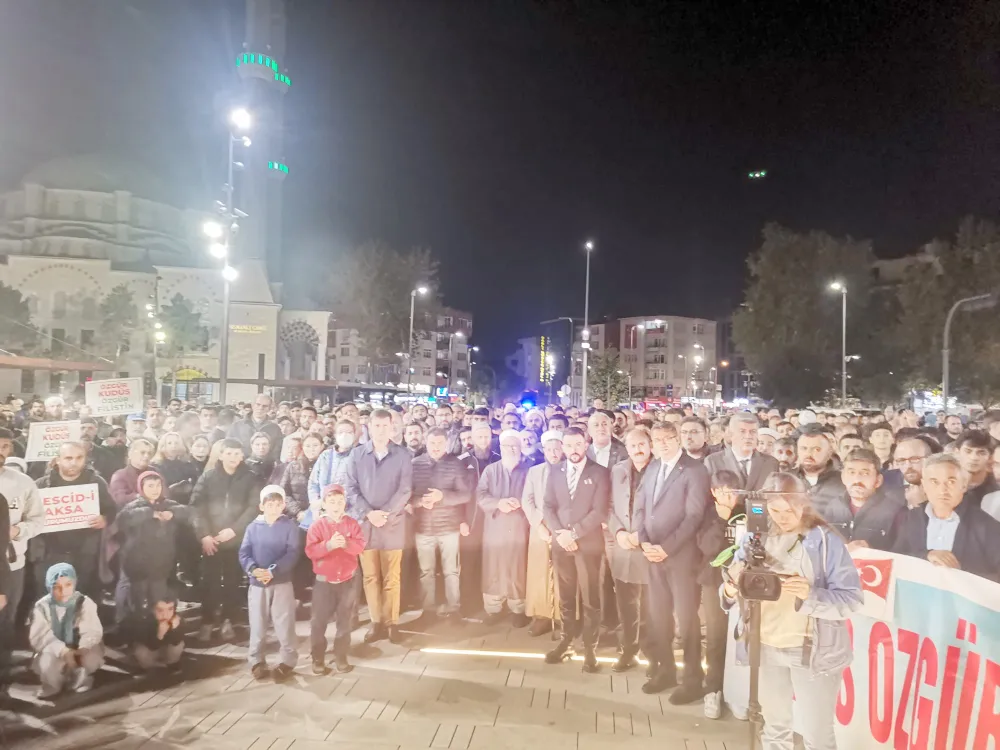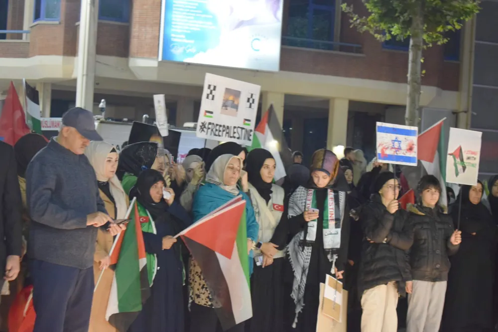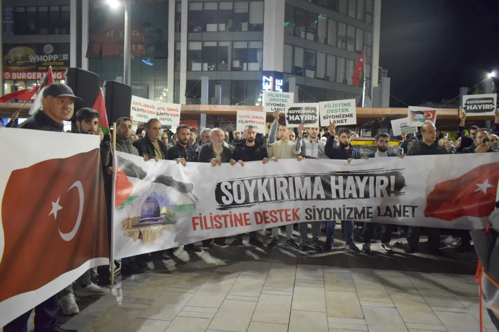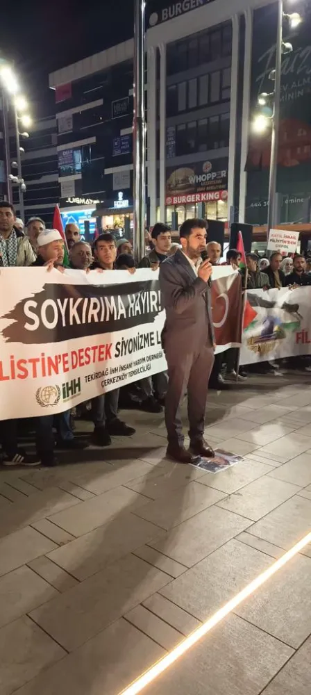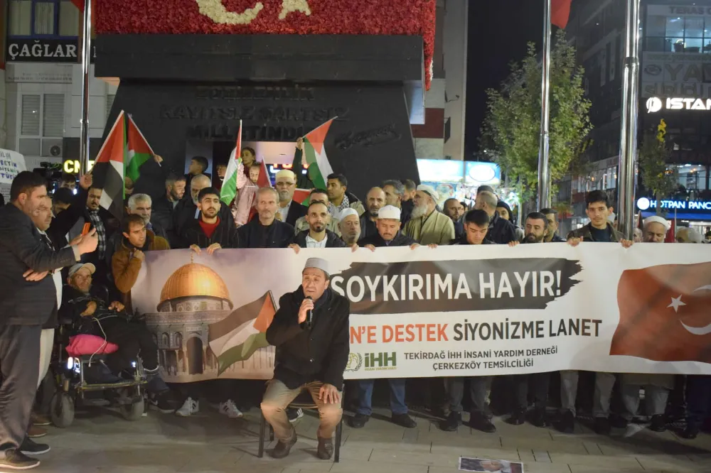 STK’lar adına bildiriyi Abdullah Olgun okudu. Olgun’un okuduğu bildiride, “İsrail'in Filistin halkına yönelik insanlık dışı saldırılarını son dönemde artırarak devam ettirmesini; bu çerçevede 17 Ekim 2023 günü Gazze'deki El-Ehli Arap Hastanesi'ni hedef alarak, aralarında bebeklerin, çocukların ve kadınların da bulunduğu yüzlerce Filistinli sivilin ölmesine ve yaralanmasına neden olan ve halen devam eden vahşice saldırılarını tüm Çerkezköy halkı ve STK’ları olarak şiddetle lanetliyoruz.”denildi.