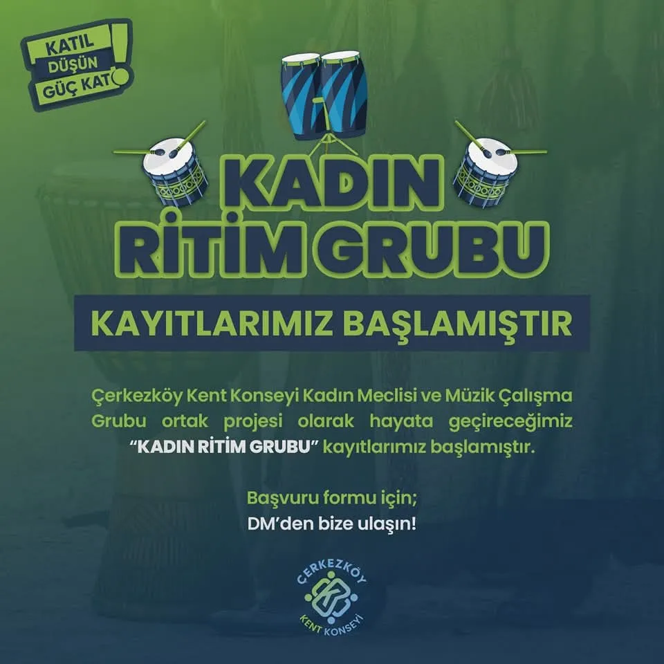 Çerkezköy Kent Konseyi kadın meclisi ve müzik çalışma grubu olarak sadece kadınların yer alacağı bir Ritim Grubu oluşturacaklarının altını çizen Volkan Kuru, “Alacaklara eğitim sonrasında bu arkadaşlarımızla bir etkinlikte vatandaşlarla bir araya gelmeyi planlıyoruz. Başvurular için Çerkezköy Kent Konseyi sosyal medya hesapları üzerinden bize ulaşabilir, başvuru formu alabilirler.”dedi.
