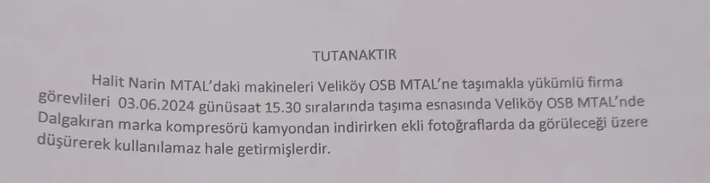“5 adet tezgâh DYNAMYTE 4400 M Habur marka dik işleme merkezi, TAKSAN TMC 500 V CNC dik işleme merkezi, TAKSAN TTC 630 CNC Torna Tezgâhı Veliköy Organize Sanayi Bölgesi Mesleki ve Teknik Anadolu Lisesi’ne taşınırken KULLANILMAYACAK ŞEKİLDE ZARAR GÖRMÜŞTÜR. TAKSAN TMC 500 V dik işleme merkezi çekme esnasında yan yatmıştır. Olay 03/06/2024 günü saat 15: 30 sıralarında olmuş, DALGAKIRAN MARKA KOMPRESÖR KAMYONDAN İNDİRİLİRKEN DÜŞÜRÜLEREK KULLANILAMAZ HALE GELMİŞTİR. Bütün bu zararların fotoğraf ve tutanakları mevcuttur.”