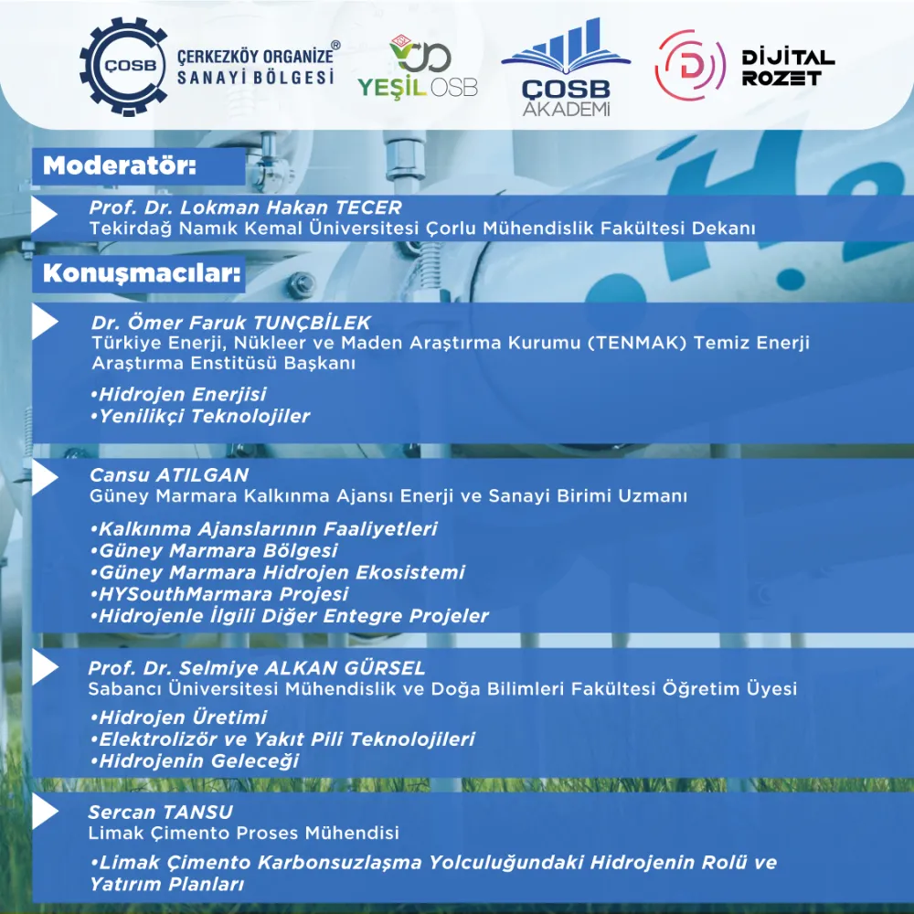 Panelin moderatörlüğünü Tekirdağ Namık Kemal Üniversitesi, Çorlu Mühendislik Fakültesi Dekanı Prof. Dr. Lokman Hakan Tecer üstlenecek. Etkinlikte konuşmacı olarak yer alacak önemli isimler ise şunlar: