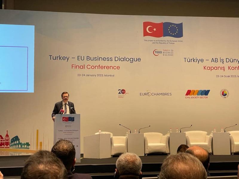 İstanbul’da düzenlenen Türkiye AB İş Dünyası Diyaloğu Projesi Kapanış Toplantısı'na, EUROCHAMBRES Başkan Yardımcısı, TOBB Başkanı Rifat Hisarcıklıoğlu, EUROCHAMBRES CEO’su Ben Butters ve Avrupa Birliği Türkiye Delegasyonu Başkanı Büyükelçi Nikolaus Meyer-Landrut’un katıldı. Programla birlikte gerçekleştirilen projeler vesilesiyle Türkiye-AB iş dünyası arasındaki diyaloğa ciddi katkılar verildiğine dikkat çekildi.
