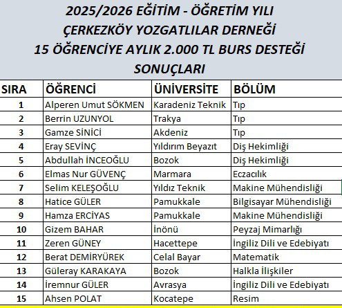 Çerkezköy Yozgatlılar Derneği, 2025-2026 eğitim-öğretim yılında 15 öğrenciye aylık 2.000 TL burs desteği vereceğini açıkladı.