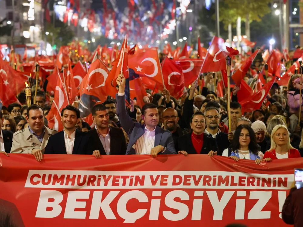 Ellerinde bayraklar ve meşaleler ile Kent Park’a kadar marşlar söyleyerek yürüyen binlerce Çerkezköylü Cumhuriyetin 101. Yıl coşkusuna ortak olurken, kortejin Kent Park’a varmasının ardından saygı duruşu ve İstiklal Marşı hep bir ağızdan okundu. Cumhuriyetin 101. Yılı anısına hazırlanan videoların izlenmesinin ardından sahneye çıkan Belediye Başkanı Vahap Akay sözlerine “Bugün 101 yaşında Cumhuriyet” diyerek başladı.