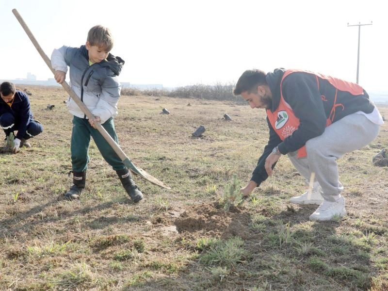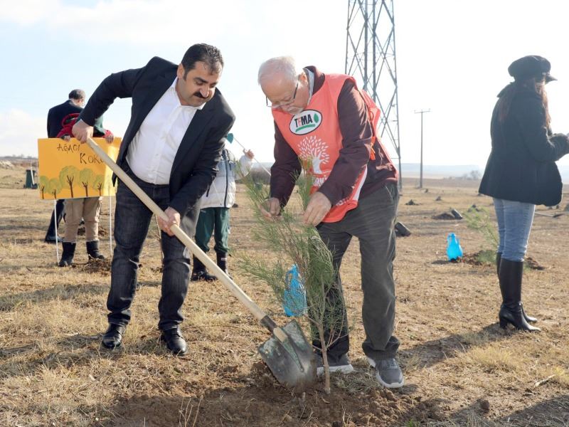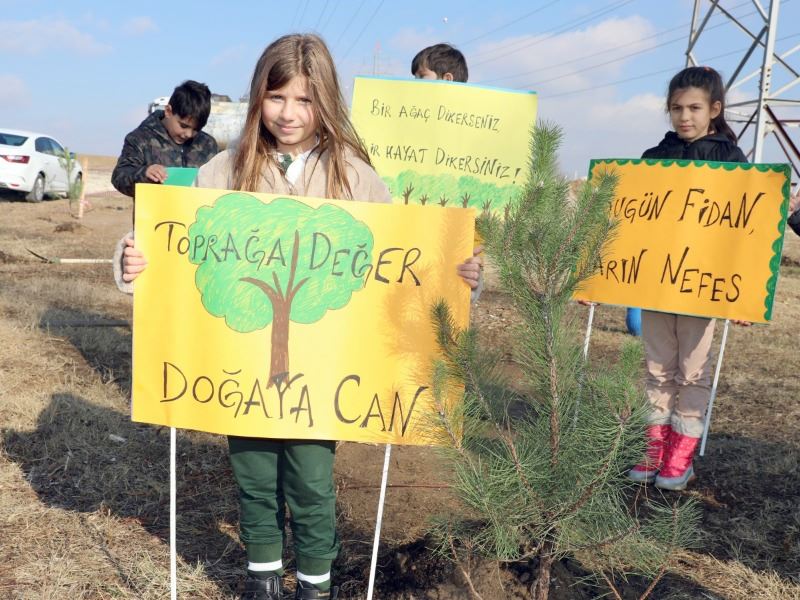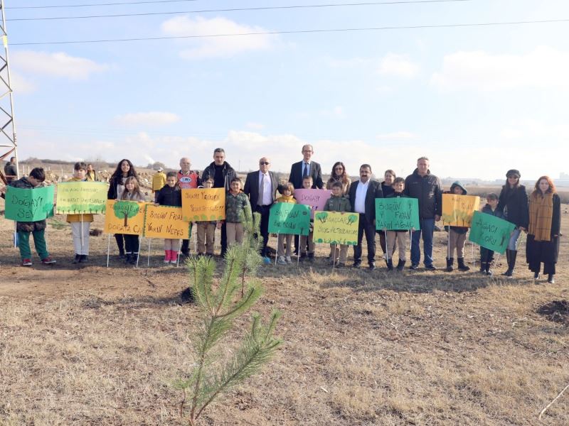 Konuşmaların ardından katılımcılar, minik öğrencilerle birlikte fıstık çamı fidanlarını toprakla buluşturarak can sularını verdiler.