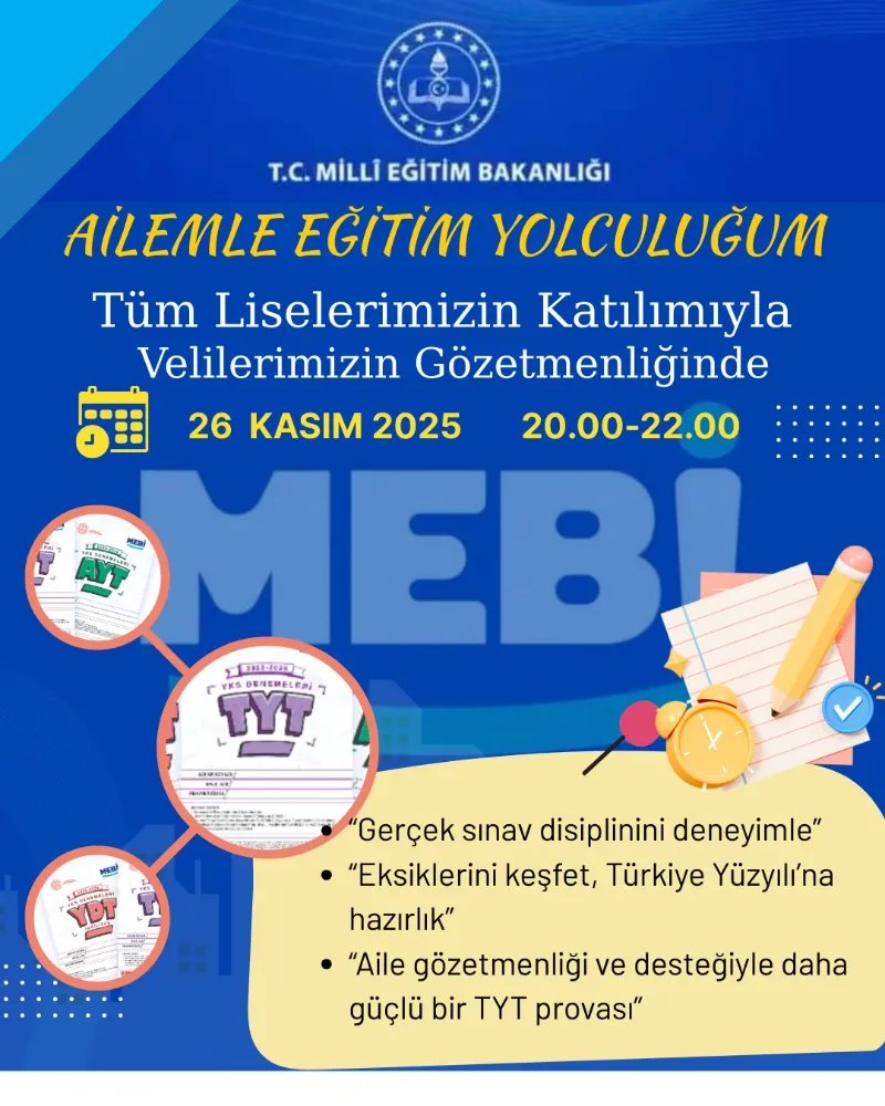 Çerkezköy İlçe Milli Eğitim Müdürlüğü, LGS ve YKS’ye hazırlanan öğrenciler için yeni bir uygulamayı hayata geçirdi. “Ailemle Eğitim Yolculuğum” projesi kapsamında, ortaokul ve lise öğrencilerine –özellikle son sınıflara öncelik verilerek, MEBİ platformu üzerinden düzenli deneme sınavları yapılacak.