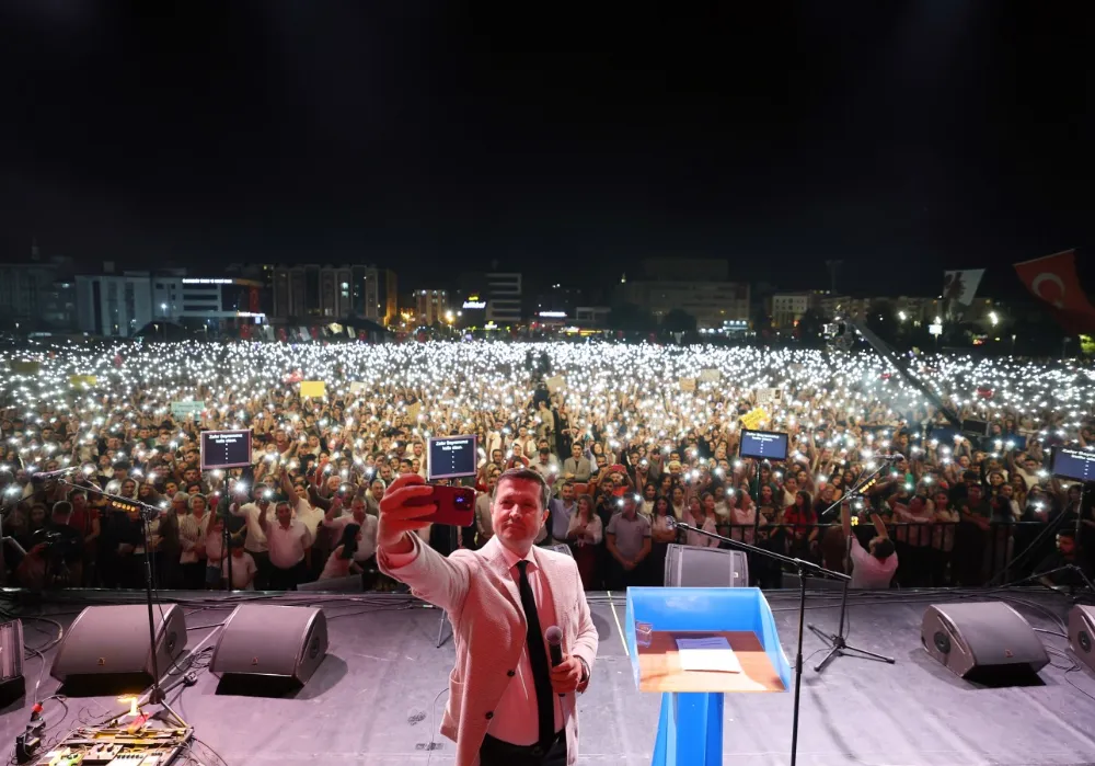 Konser alanını dolduran binlerce Çerkezköylü’ye hitap eden Belediye Başkanı Vahap Akay, “Bir Ağustos gecesi ay, hilal gibi, bir yanıp bir sönüyordu. Bir Ağustos gecesi, hiç kimse ne olacağını, nereye varacağını bilmeden yeni bir sabaha uyanıyordu. Sisli bir Ağustos sabahı, herkes, hepimize yetecek küçücük bir kıvılcımı bekliyordu. Çorak bir ovada, bozkırın derinliklerinde betondan fışkıran, sapsarı çiçekler açan, her şeye meydan okuyan ayçiçekleri gibi, bir büyük umuda, bin bir zorlukla göğüs gerenlerin, büyük bir umuda inatla, ısrarla, gayretle tutunanların, bir büyük umudu, her şeye rağmen, pes etmeden geleceğe taşıyanların, 4 yıllık bir mücadeleyi zafere ulaştırmaya çabalayanların, olmazı oldurmaya çalışanların, imkansızı yok sayanların, kocaman yürekleri ile en önde koşanların hikayesi.