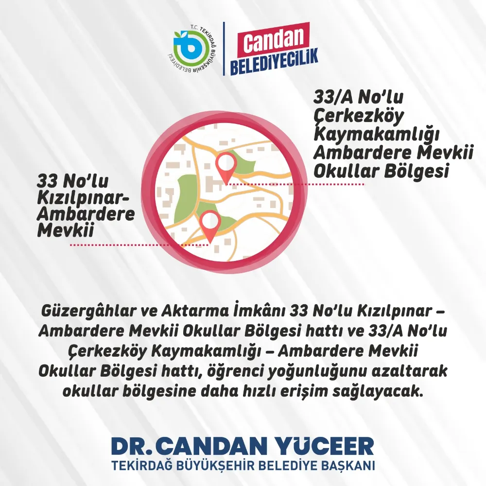 33 No’lu Kızılpınar – Ambardere Mevkii Okullar Bölgesi hattı ve 33/A No’lu Çerkezköy Kaymakamlığı – Ambardere Mevkii Okullar Bölgesi hattı, öğrenci yoğunluğunu azaltarak okullar bölgesine daha hızlı erişim sağlayacak. TEKULAŞ’ın bu yeni hatlarıyla TETUS’un diğer hatlarına 30 dakika içerisinde ücretsiz aktarma imkânı da sunulacak.