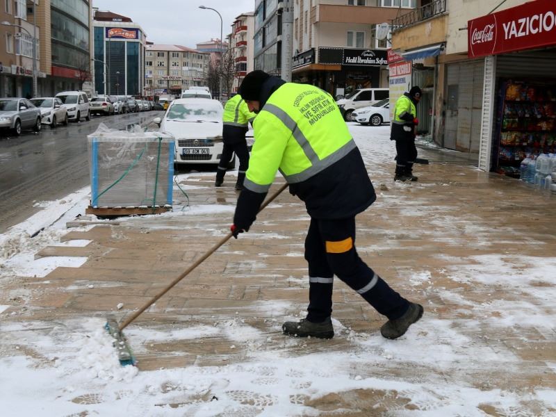 "Bölgemizi etkisi altına alan soğuk hava nedeniyle kent genelinde herhangi bir olumsuzluk yaşanmaması adına ekiplerimiz yine görevinin başındaydı. Zabıta Müdürlüğü’müze bağlı ekiplerimiz, cadde ve sokaklarımızda ring atarak gerçekleştirdikleri kontroller sonucu önlem alınması ya da olumsuzluk yaşanması muhtemel noktaları Makine İkmal Bakım ve Onarım Müdürlüğü ekiplerimize bildirdi. Kar yağışı öncesinde kentimiz genelinde solüsyon çalışması yapan ekiplerimiz, daha sonra kritik noktalarda tuzlama çalışmalarını sürdürdü.