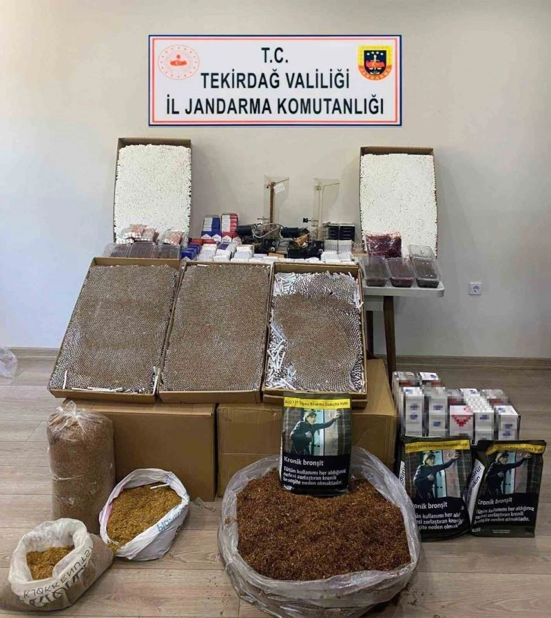 Tekirdağ’ın Çerkezköy ilçesinde jandarma ekiplerince bir iş yerinde yapılan aramada, 130 bin adet dolu makaron, 42 kilogram kıyılmış tütün, 10 bin adet boş makaron, 2 adet tam otomatik makaron doldurma makinesi ve 45 kilogram nargile tütünü ele geçirildi.