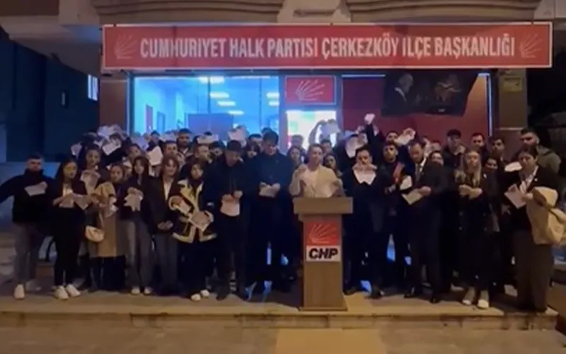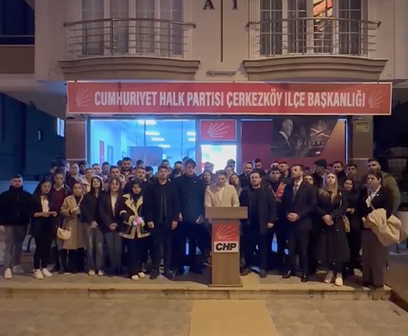 Dün akşam saatlerinde İstanbul Üniversitesi Rektörlüğü’nce Büyükşehir Belediye Başkanı Ekrem İmamoğlu’nun diplomasının iptal edildiği duyurulunca CHP’li gençler Çerkezköy İlçe Başkanlığı’nda toplanarak, Gençlik Kolları Genel Başkan Yardımcısı Aytekin Şahinkaya öncülüğünde kararı protesto etti.