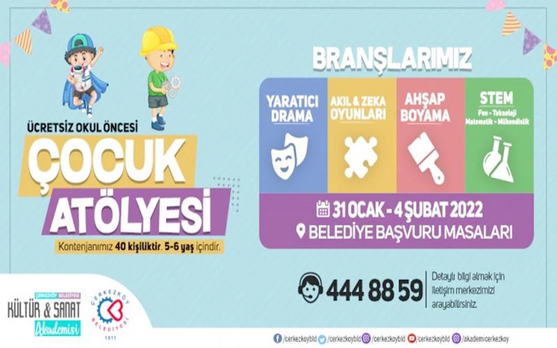 Çerkezköy Belediyesi tarafından açılacak olan ve 5-6 yaş çocuklar için 4 farklı branşta ücretsiz eğitimlerin verileceği Çocuk Atölyesi başvuruları 31 Ocak-4 Şubat tarihleri arasında yapılacak.
