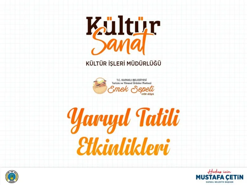 Kapaklı Belediye Başkanı Mustafa Çetin, “Kıymetli çocuklarımız için bu yarıyıl tatilinde de çeşitli atölye çalışmaları, tiyatro ve illüzyon gösterileri ile birbirinden eğlenceli etkinliklerin olacağı bir etkinlik takvimi hazırladık. 20-31 Ocak tarihleri arasında Atatürk Kültür Merkezi ve Emek Sepeti Üretim Atölyesinde ücretsiz olarak düzenleyeceğimiz etkinliklere tüm çocuklarımızı bekliyorum. Ailelerimiz 444 80 59 çağrı merkezimizden ve Kültür İşleri Müdürlüğümüzden detaylı bilgi alabilirler.” dedi.